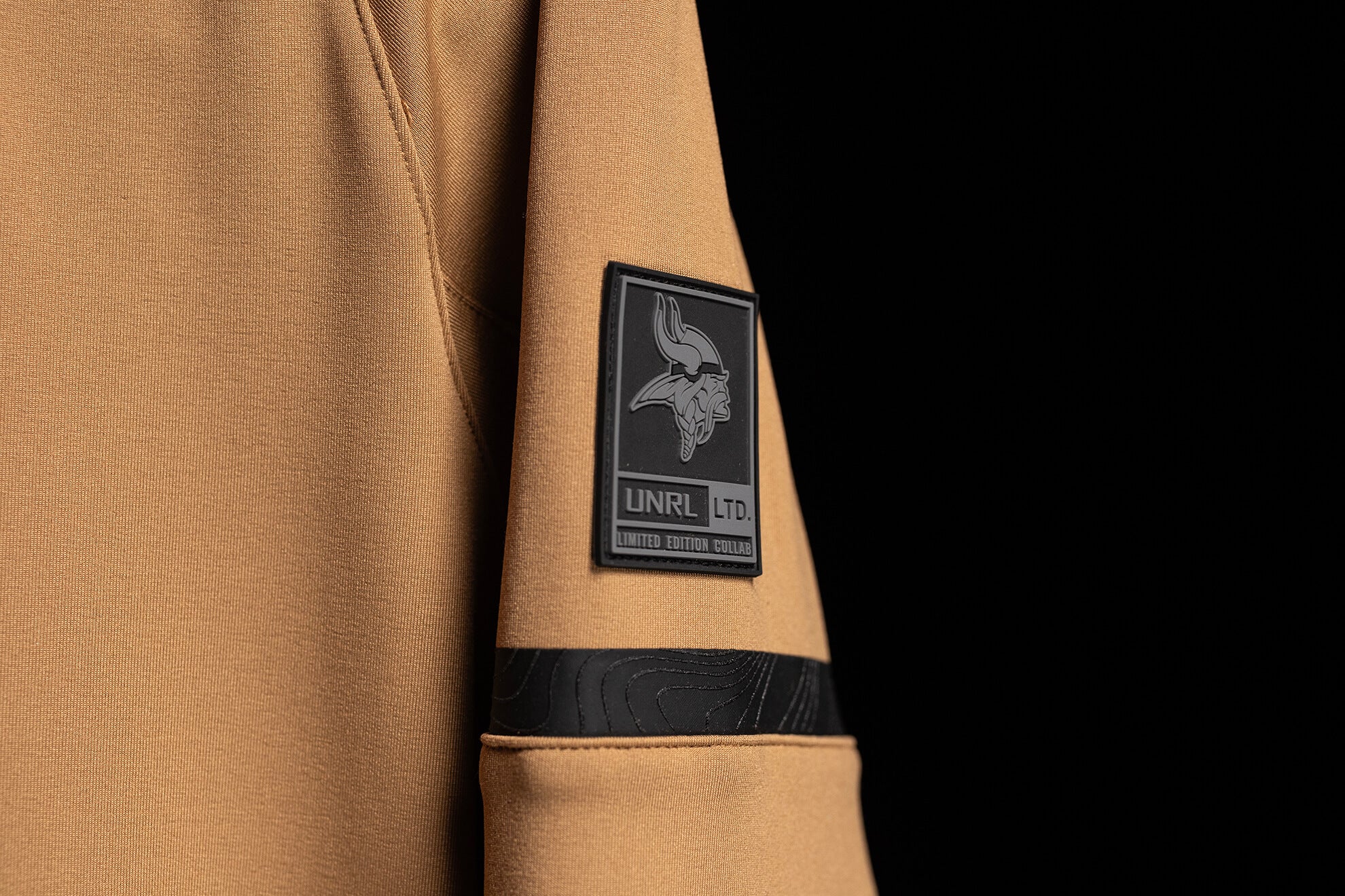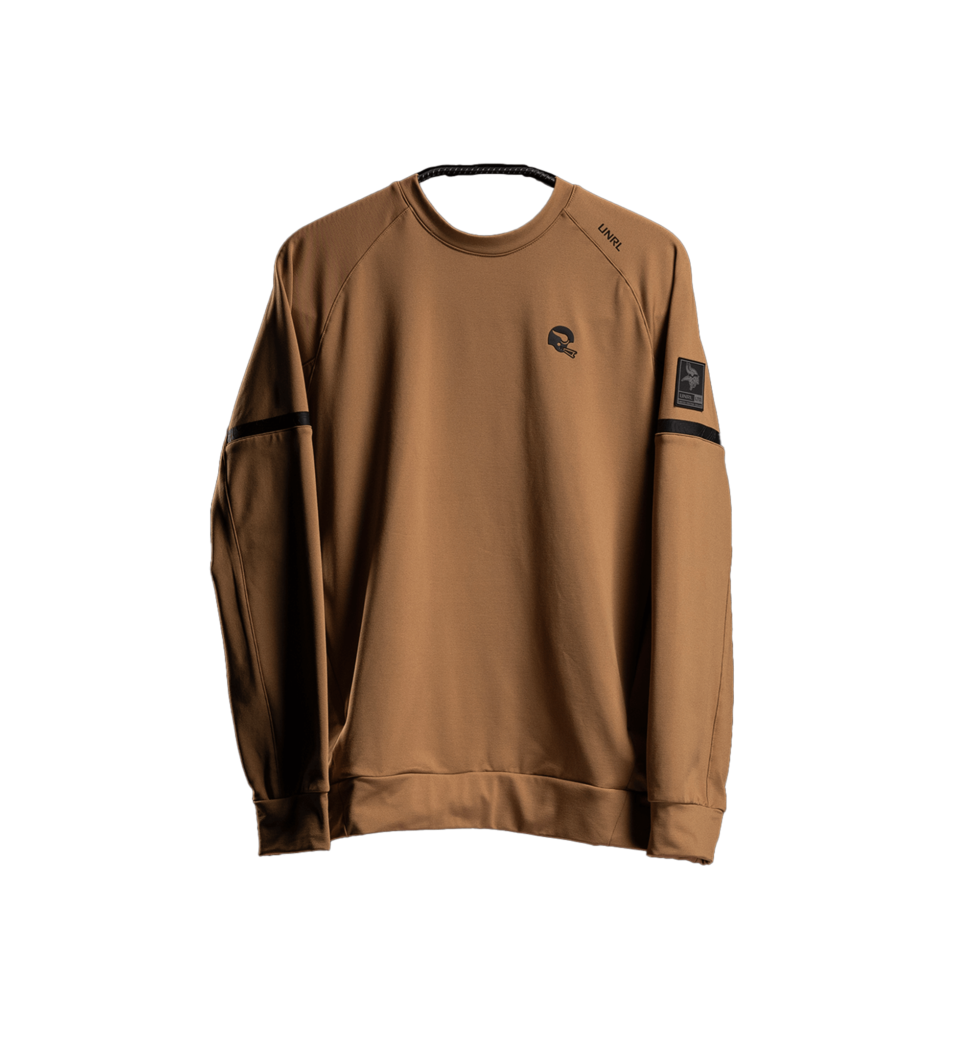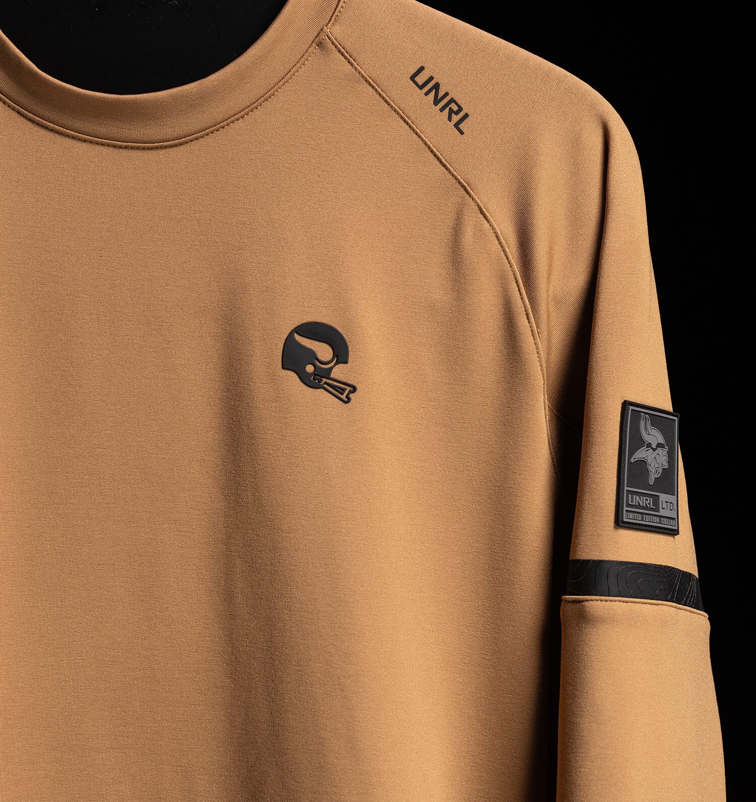 Taking cues from classic football heritage, this Crossover Crewneck features a camel base colorway, evoking timeless themes of pigskin and cotton jerseys. A vintage Vikings helmet logo and black striped sleeves with a subtle topographic print add a touch of UNRL’s design DNA. It’s a versatile piece that balances tradition with a modern edge.